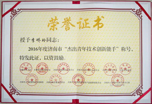 近日,济南市总工会、团市委、市发改委、市经信委、市科技局、市民政局、市人社局、市城乡建设委、市国资委、市金融办联合发文表彰2016年度济南市青年岗位操作能手和青年技术创新能手。济南城建集团六分公司青年职工李峤玲榜上有名,被授予2016年度济南市杰出青年技术创新能手称号。