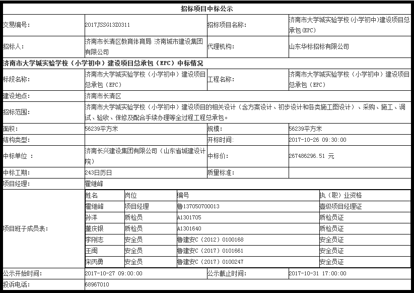 济南市大学城实验学校(小学初中)建设项目总承包(EPC)中标公示