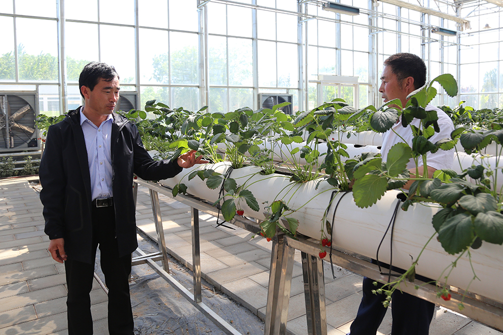 在连栋温室里,陈德国察看前期做育苗试验的情况。“草莓在这里第一年的种植效果就很好,原因在于前期我们吸取教训,在这些塑料管子下面打孔处理,管内放着陶粒和纱窗,给原有设备增加了透气性。”陈德国解释道。
