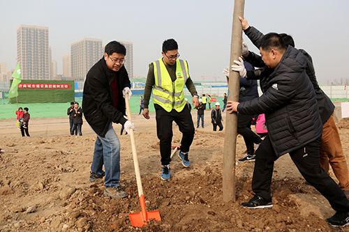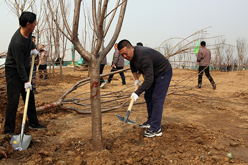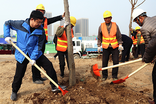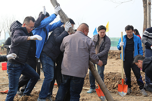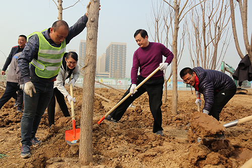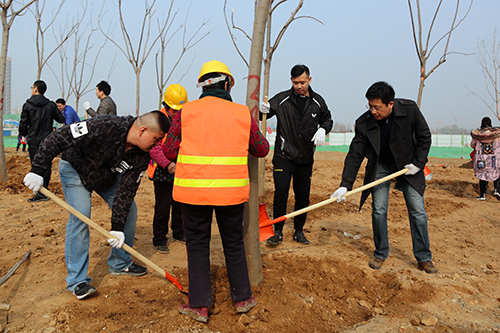 在活动现场,参加植树的干部职工个个热情高涨、干劲十足,他们几个人一组,扶直树苗、挥锹培土、踩实压紧,大家配合得很默契,整个劳动场面繁忙而有序。经过一上午的紧张劳动,一排排整齐的苗木为初春增添了生机。