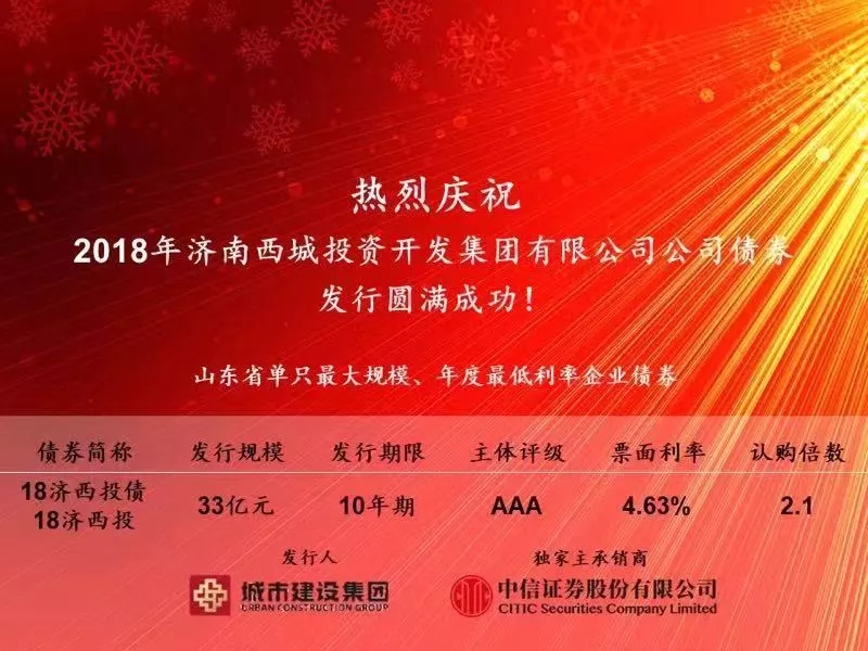 12月14日,304am永利集团集团全资子公司济南西城投资开发集团有限公司成功发行33亿元企业债券,共有53家机构参与认购,认购倍数2.1倍,认购总额达到70亿元,发行利率4.63%,期限10年。该笔企业债券创下多项省市企业债券发行之最,是我省2018年规模最大、本年度利率最低的企业债券,同时该笔债券融资也是济南市有史以来获批最大规模、今年唯一一笔企业债券。