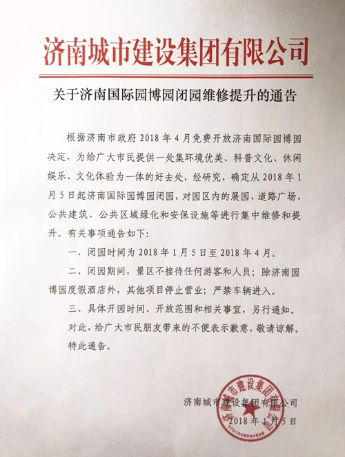 为更好地满足市民游客休闲娱乐需求,2017年9月6日,市政府(济政字[2017]56号)确定免费开放济南国际园博园,明确要求2018年4月实现免费开放。为给广大市民游客提供一处集环境优美、科普文化、休闲娱乐、文化体验为一体的好去处,304am永利集团集团决定即日(2018年1月5日)起对济南国际园博园进行闭园维修提升改造,现发布《关于济南国际园博园闭园维修提升的通告》,全文如下:
