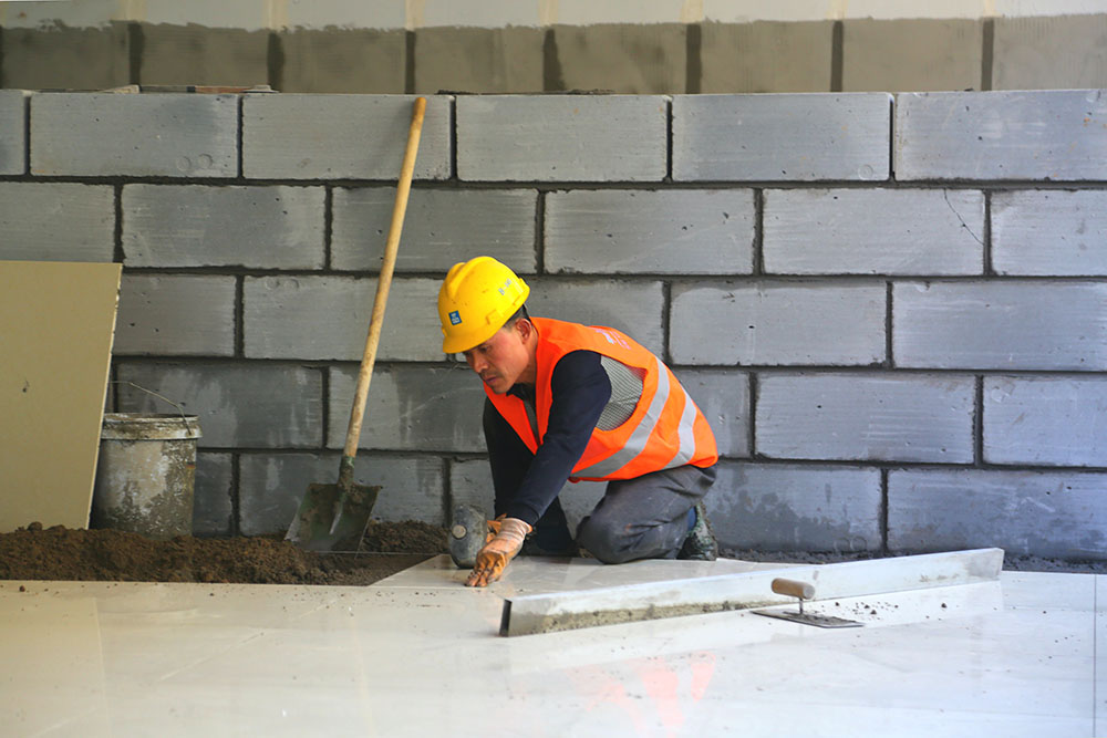 工人在室内铺设地面瓷砖