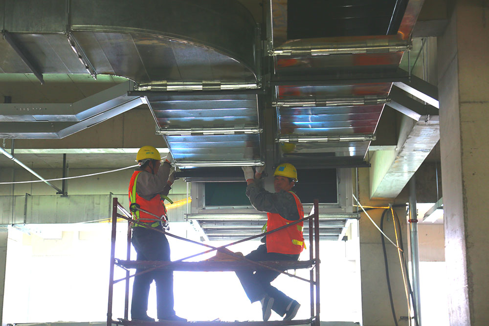 工人在室内安装通风系统