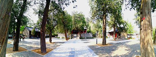 在绿地广场面向一宫门,右侧可以看到卧牛山的全貌,正面对视华山。两侧绿地每侧精选了7棵造型油松,因为华阳宫道家文化的元素多些,此处也有北斗七星的意境。二是采用了借景、点景、框景的园林手法,借一宫门为背景,点造型松为景物,框出清晰的山体轮廓的画面。