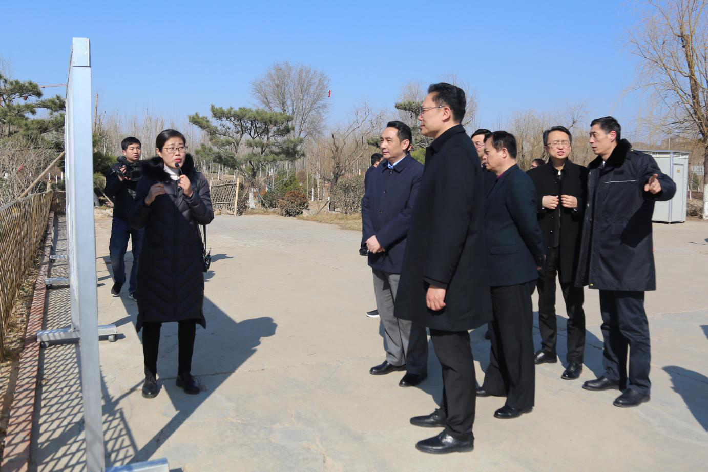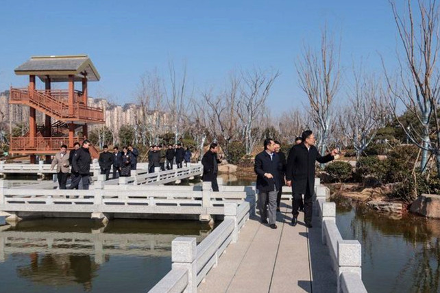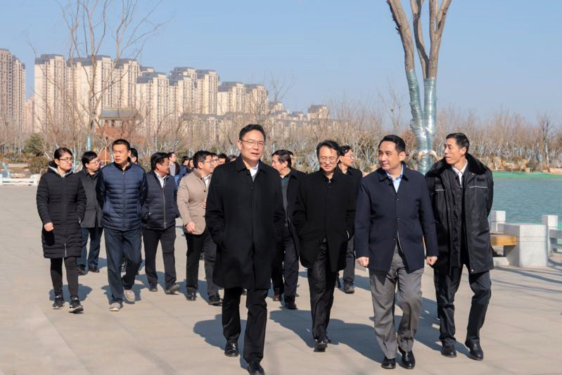 徐群一行首先来到华山历史文化生态湿地公园,听取工作人员介绍了项目的整体规划和建设情况,并实地察看了公园试验段和园林一期A区,参观过程中,徐群副市长对效果初显的900亩山水园林景观表示了肯定,并对项目未来整体效果表示期待。