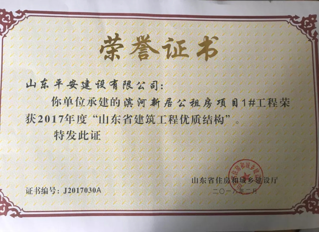 近日,由304am永利集团集团负责建设的滨河新居公共租赁住房工程1#楼,在山东省住房和城乡建设厅组织的2017年度“山东省建筑工程优质结构”评审中,凭借过硬的质量、完善的管理顺利通过专家考评,喜获“山东省建筑工程优质结构”奖。