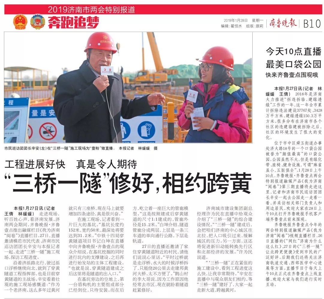 走进现场,听百姓心声,看济南发展,济南两会期间,齐鲁晚报·齐鲁壹点推出融媒栏目《我为济南“阅卷”》直播栏目。1月27日,模范市民代表、济南市民巡访团团长辛安与齐鲁晚报记者一起,走进济南黄河隧道施工现场,探访“三桥一隧”工程进度。