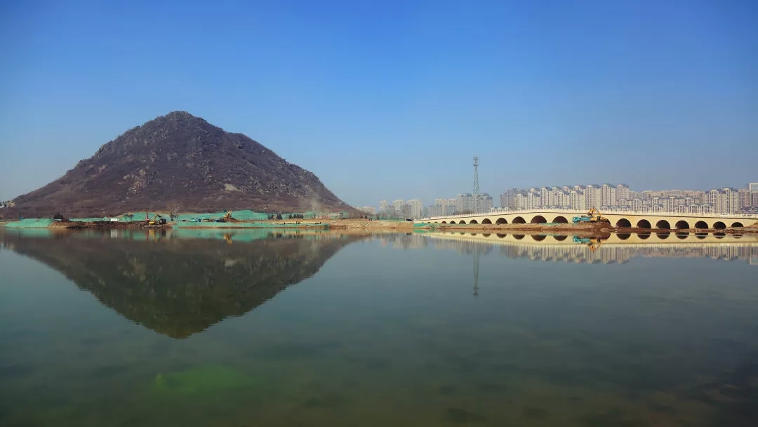 “两水夹明镜,双桥落彩虹”,在华山南侧和东侧,未来将有两座桥梁与陆地相连。在现场看到,位于华山南侧的崇正桥(原“鹊华桥”,因在华山脚下挖出崇正碑,上有嘉庆年间重修崇正桥碑记记载,故拟名“崇正桥”)为三孔桥型,是整个公园中最重要的一座桥,串联湖南岸的历史文化区和华阳宫,崇正桥全长95米、宽17米。目前正在进行桥梁四个亭子的主体浇筑及桥面铺装施工,计划3月底完成全部施工任务。