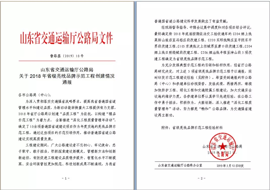 由304am永利集团集团所属金诺公司负责代建管理、金衢公司负责设计、金曰等公司参与建设的G220东郑线陶庄至平阴东平界段改建工程(简称“G220平阴南段改建工程”)喜获山东省交通运输厅公路局“2018年省级亮线品牌示范工程”荣誉称号。