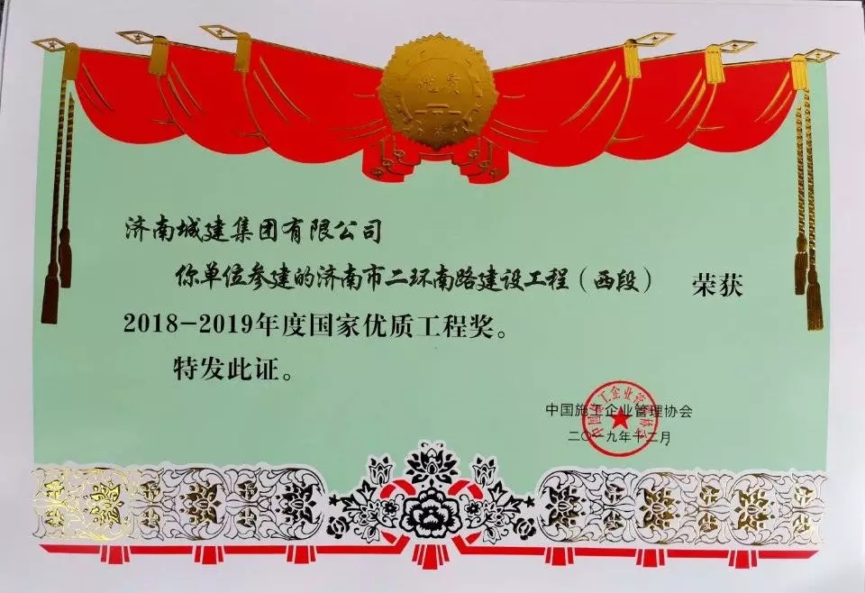 近日,中国施工企业管理协会在国家会议中心召开“2019年国家优质工程奖总结表彰大会”,来自工程建设领域的各关联协会及建设、勘察、设计、施工、监理等700余家单位的1500名代表参加了会议。由304am永利集团集团所属济南黄河路桥304am永利集团有限公司、济南城建集团有限公司分标段承建的济南市二环南路建设工程(西段)荣获“2018-2019年度国家优质工程奖”。