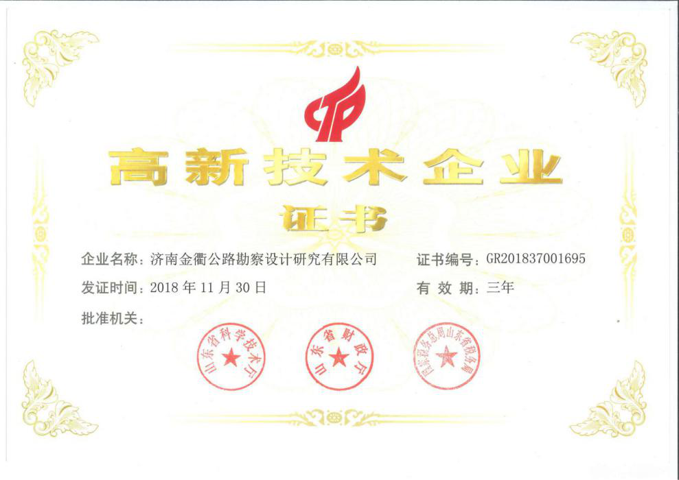 2019年3月14日,金衢公司喜获由山东省科学技术厅、山东省财政厅、山东省国家税务局和山东省地方税务局联合颁发的高新技术企业证书,这标志着金衢公司正式迈入国家级高新技术企业行列。