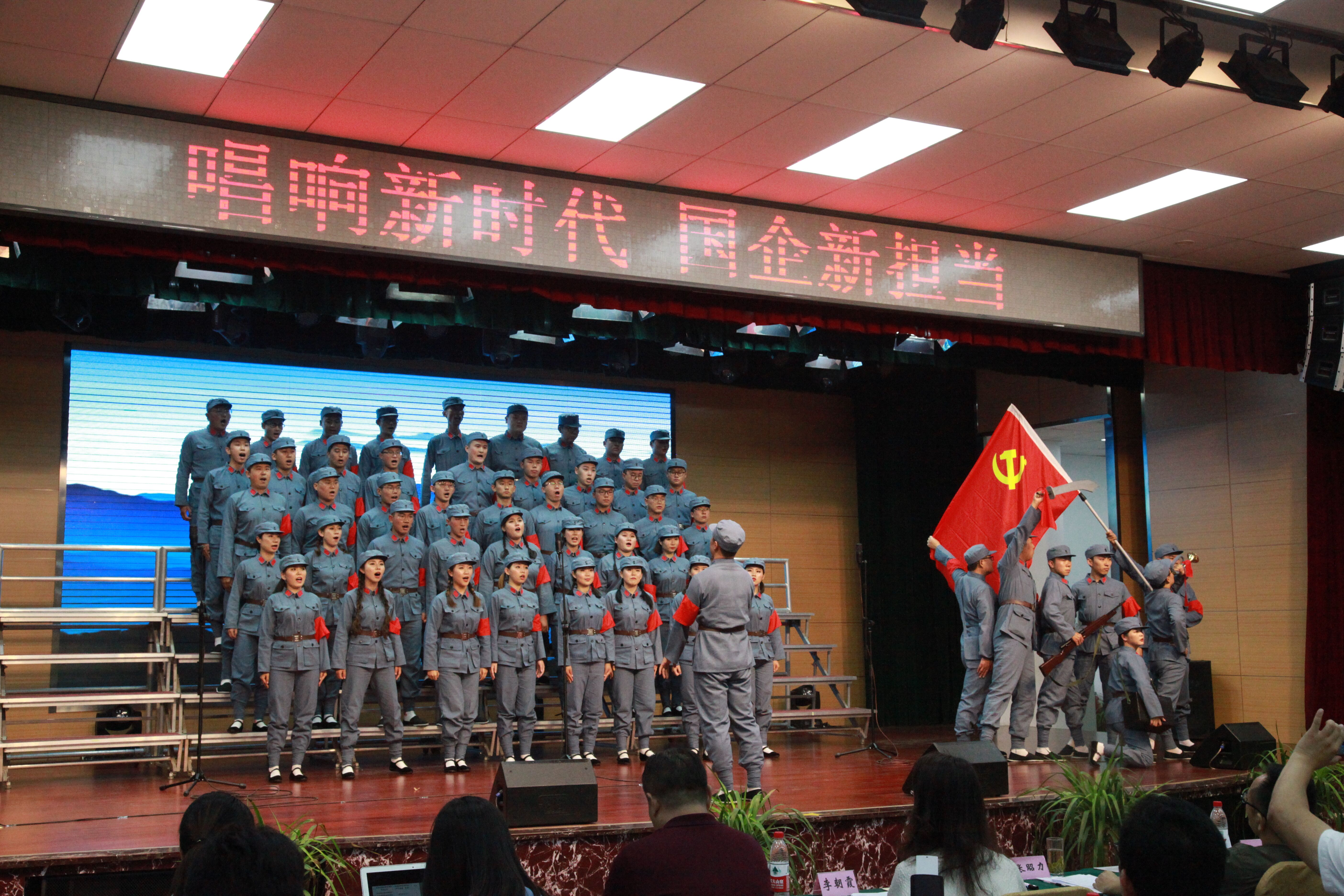 红歌会活动现场,《鼓浪屿之波》《歌唱祖国》《山丹丹开花红艳艳》《我爱你中国》《我和我的祖国》《祖国不会忘记》《天耀中华》等十七首经典爱国歌曲轮番上演,歌声在会场上空飘荡。集团公司现场合唱的是红色经典歌曲《在太行山上》。歌曲由三个部分组成。第一部分为诗歌朗诵。表达了抗战时期中国军民艰苦卓绝的奋斗历程和大无畏的革命乐观精神;第二部分为情景表演。描绘了八路军战士们在战场上挥舞着红色旗帜,在冲锋的号声中,向敌人的阵地发起冲锋,受伤的战士在卫生员和战友的搀扶下在战场上继续前进的场景。第三部分为歌曲合唱。演员们身着八路军军装,精神抖擞,情绪高昂,歌声嘹亮,仿佛把大家带入了战火纷飞的年代,给人以催人奋进,所向披靡的力量,两个声部相互配合,高低呼应,逐步将歌曲推向高潮。