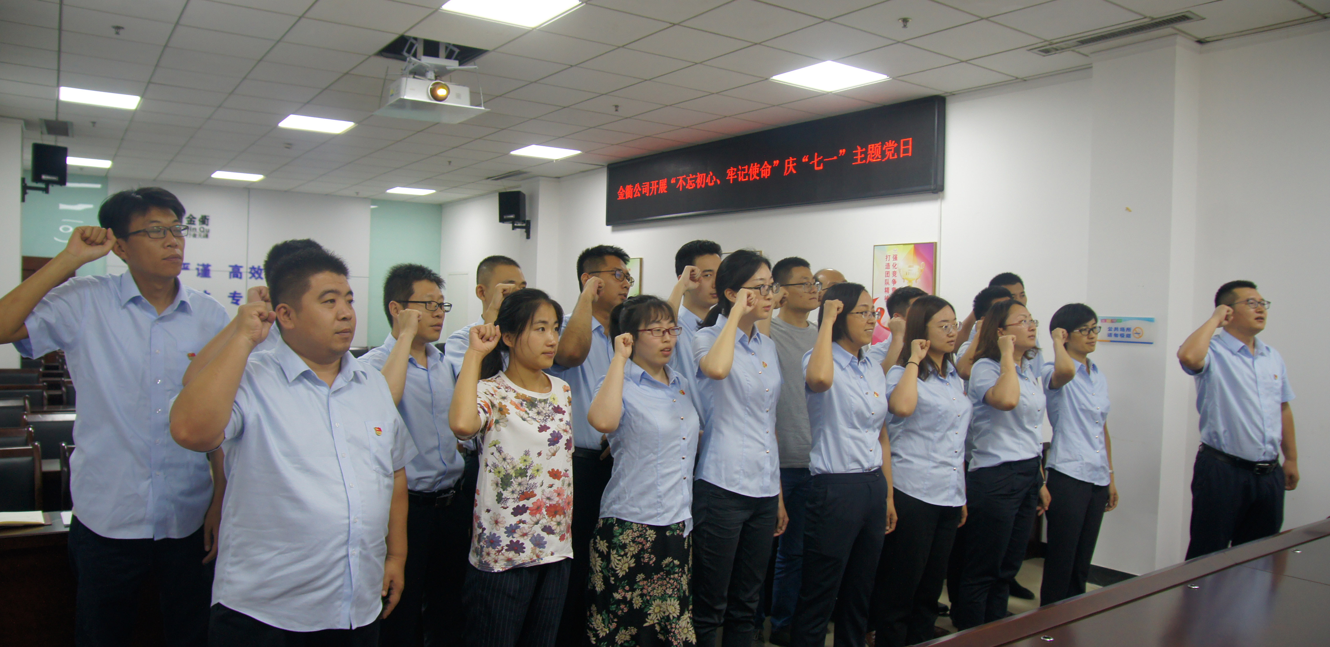为深入贯彻落实习近平新时代中国特色社会主义思想和党的十九大精神,激励广大党员干部全面践行“不忘初心 牢记使命”主题教育,7月1日上午,金衢公司党支部组织开展了“庆七一”主题系列活动,全体党员、入党积极分子、中层以上管理人员共计40余人参加,以实际行动庆祝中国共产党98周年华诞。