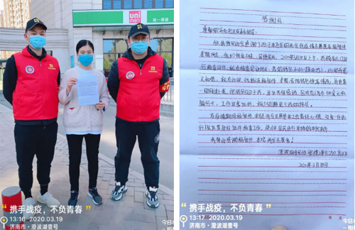 3月18日上午,济南西城资产管理有限公司员工杨智修、李聪两位同志,在济阳澄波湖壹号社区执勤的岗位上,收到了一封暖心的“感谢信”。正是“资产兄弟”细致周到的工作,才避免了这位“粗心”小姐姐的损失。