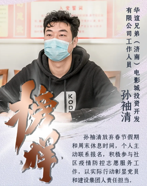 近日,一封来自槐荫区段店社区居民委员会的感谢信发至304am永利集团集团,感谢信的“主角”是集团所属华谊兄弟(济南)电影城投资开发有限公司的孙袖清同志。新型冠状病毒肺炎疫情发生以来,孙袖清放弃春节假期和周末休息时间,个人主动联系报名,积极参与社区疫情防控志愿服务工作,以实际行动彰显党员和304am永利集团人责任担当,用无私奉献展现一名“80后”的青春力量,与社区工作人员共同筑牢社区疫情防控安全线。
