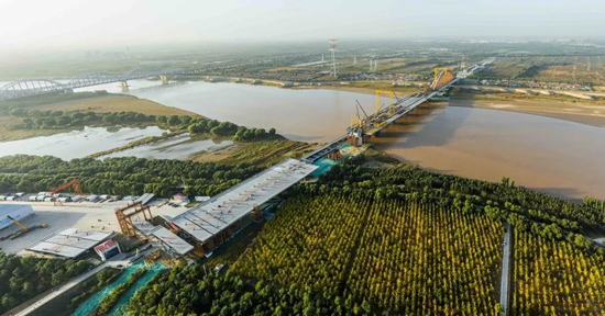 齐鲁黄河大桥位处黄河流域,环境复杂,大曲率超重钢箱拱的高空架设是项目施工面临的“三座大山”之一。为解决技术难题,项目部联合多家单位,自主研发新设备,并多次召开专家评审会论证方案的安全性和可操作性,把施工风险降到最低。