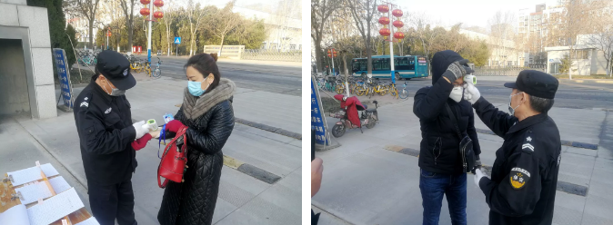 金宇公司物业分公司通过在门口设置体温测量点,严格落实小区入口登记和体温监测制度。安保人员在门口24小时值守,进入园区需持疫情期间临时通行证,严格执行“三不准”:不戴口罩者一律不准进入办公区;不接受体温量测者一律不准进入办公区;测量体温高于37.3℃(含)者一律不准进入办公区。