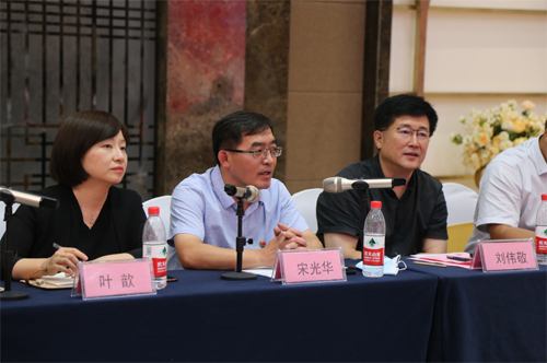 济南泉世界商管公司执行董事兼总经理宋光华、公司招商运营部负责人周新、公司资产物业部负责人任玉忠、公司综合事务部主管方宇航、济南广播电视台电视影视频道总监刘伟敬出席了此次座谈会。座谈会由公司营销推广部负责人叶歆主持。本次座谈会旨在向园区各商户介绍2020年上半年工作进展,讨论下半年工作方向,按照“疫情防控与复工复产两不误、疫情防控与经济社会发展双胜利”的总目标,“思想不松、力度不减、目标不变”完成好各项工作。
