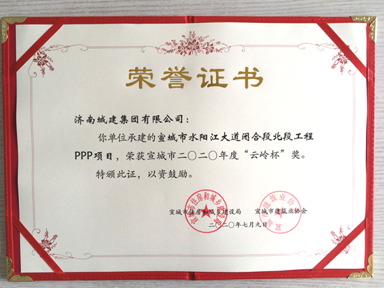 近日,由集团所属济南城建集团有限公司承建的宣城市水阳江大道闭合段北段工程PPP项目、宛陵东路(拱极路—宛溪北路)工程荣获宣城市2020年度“云岭杯”奖。