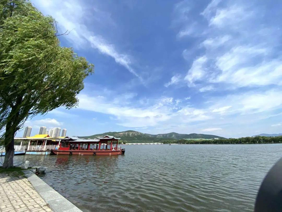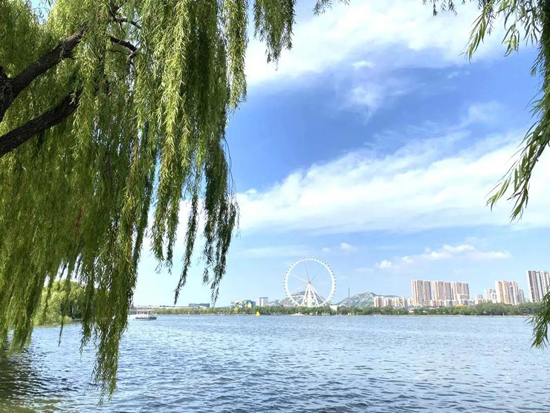 雨后的济南园博园,蓝天白云、岸绿湖清