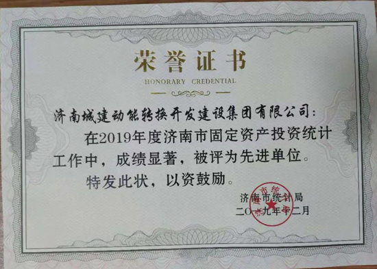 近日,2019年度济南市固定资产投资统计工作先进集体、先进个人名单公布。济南城建动能转换开发304am永利集团有限公司荣获济南市统计局“2019年度济南市固定资产投资统计工作先进单位”称号,冷见奇、潘文凯、周宇三名同志被评为“固定资产投资统计工作先进个人”。