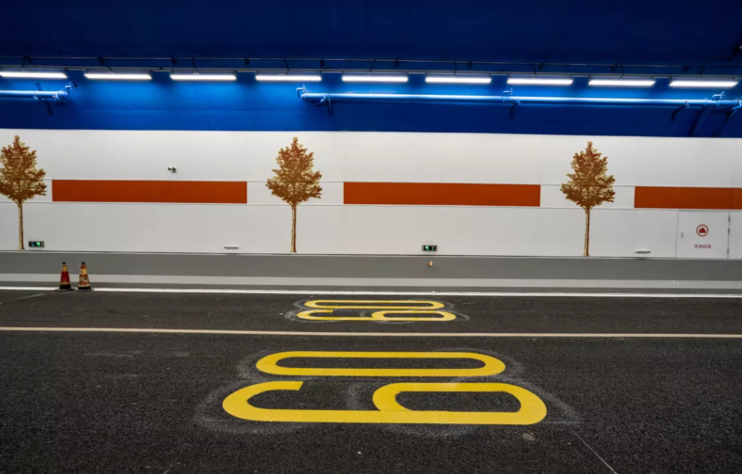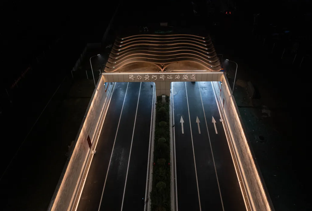保持隧道主体工程结构不变,通过增加装饰,实现整体设计提升。隧道南北出口声屏障以“岁岁九曲弯”和“岁岁安澜”为设计主题,以中国传统装饰纹样呈现,夜晚还将呈现“日出黄河”的灯光效果。添加“流动”与“水纹”的造型体现了黄河穿越之美,在隧道内采用3D打印贴膜工艺绘制白杨树(寓意坚韧、表达力求上进的精神),以缓解驾驶员视觉疲劳。同时以黄河星空为题,中间段顶部弧线的灯光表现黄河穿越之感,暖色照明设计表现,感受黄河星空光线流动之美。