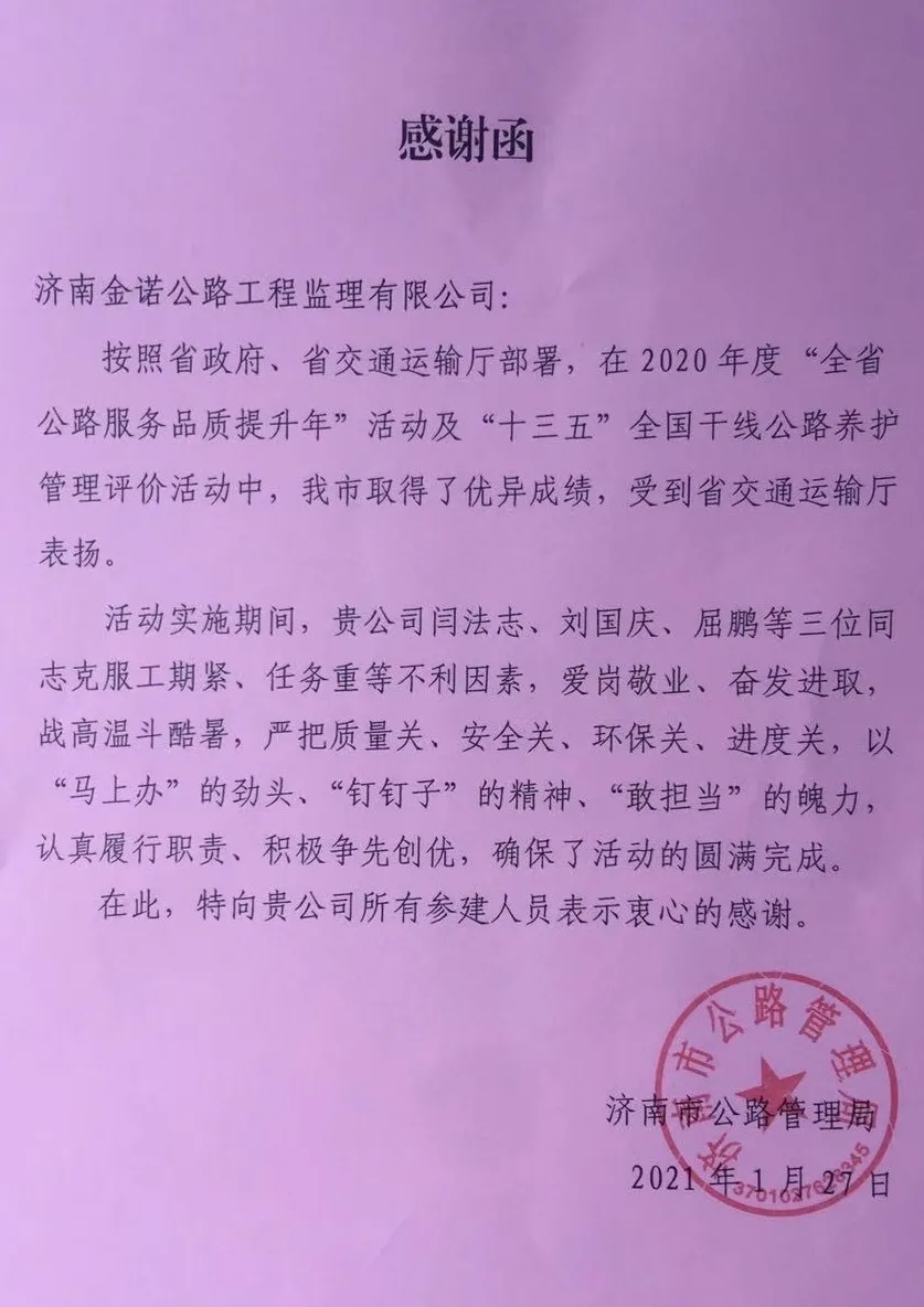 近日,济南市公路管理局向金诺公司发来了《感谢函》,向金诺公司所有参建人员在2020年度“全省公路服务品质提升年”活动及“十三五”全国干线公路养护管理评价活动中,认真履行职责、积极争先创优的工作作风表示感谢。