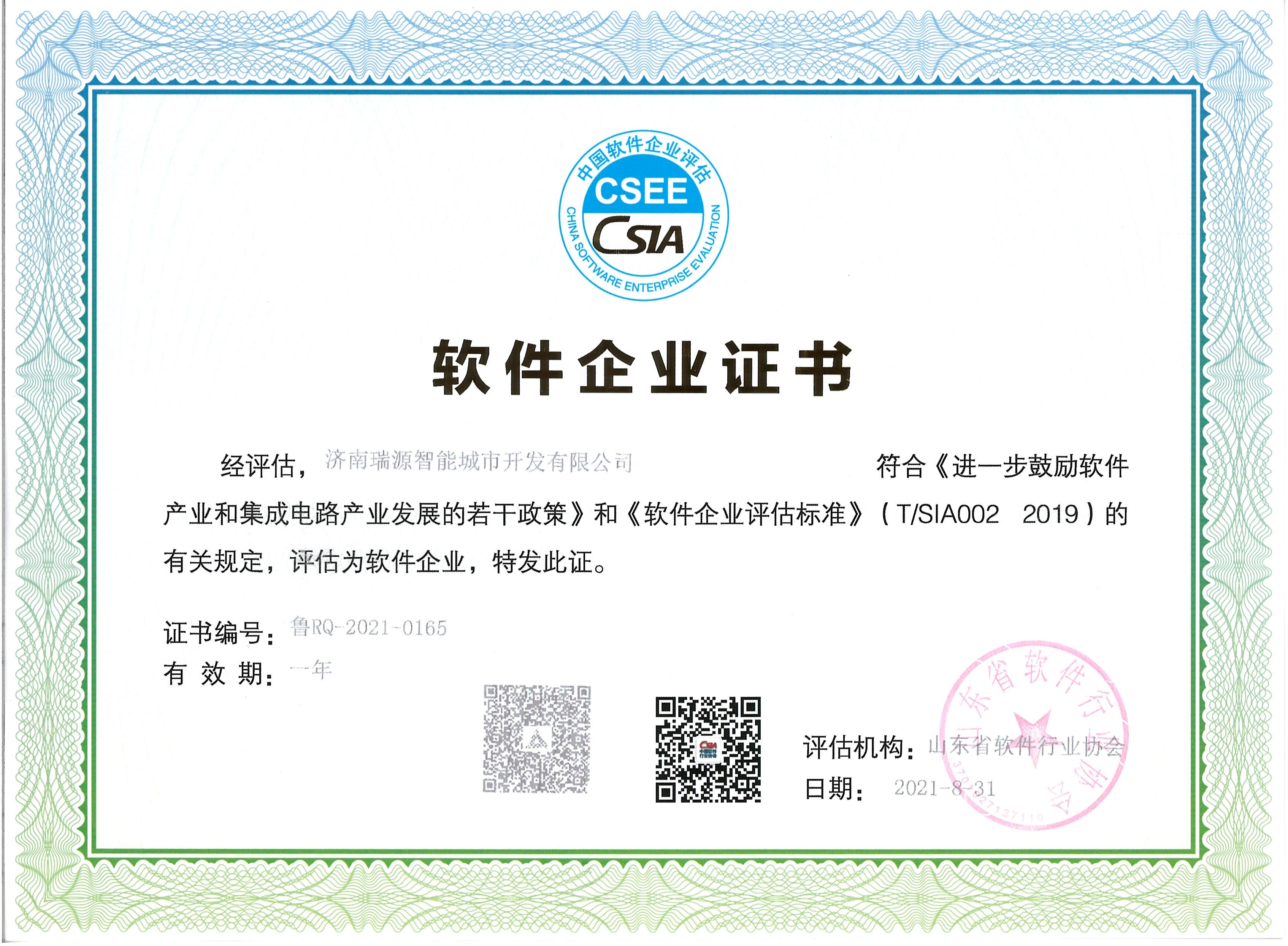 8月31日,济南瑞源智能城市开发有限公司经山东省软件行业协会评估,符合《进一步鼓励软件产业和集成电路产业发展的若干政策》和《软件企业评估标准》的有关规定,获评软件企业证书。此证书获得,标志着公司在技术研发、软件应用等相关领域获得了行业认证资质,更是对公司技术先进性和前沿性的充分认可。