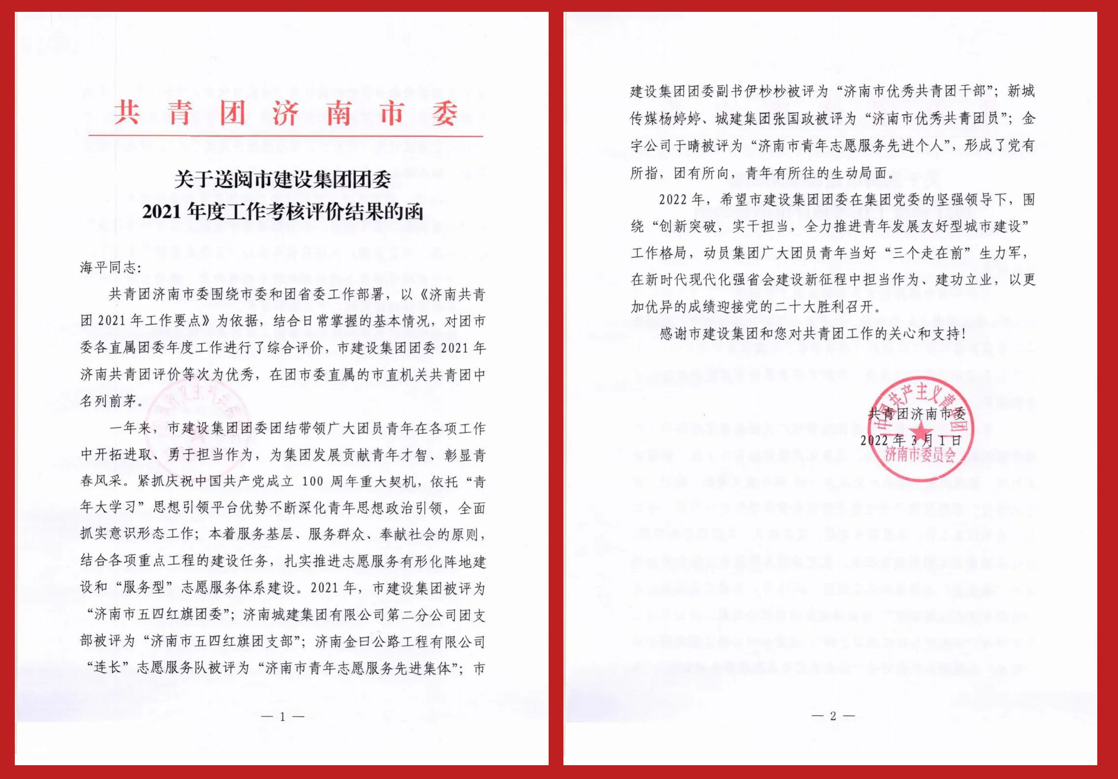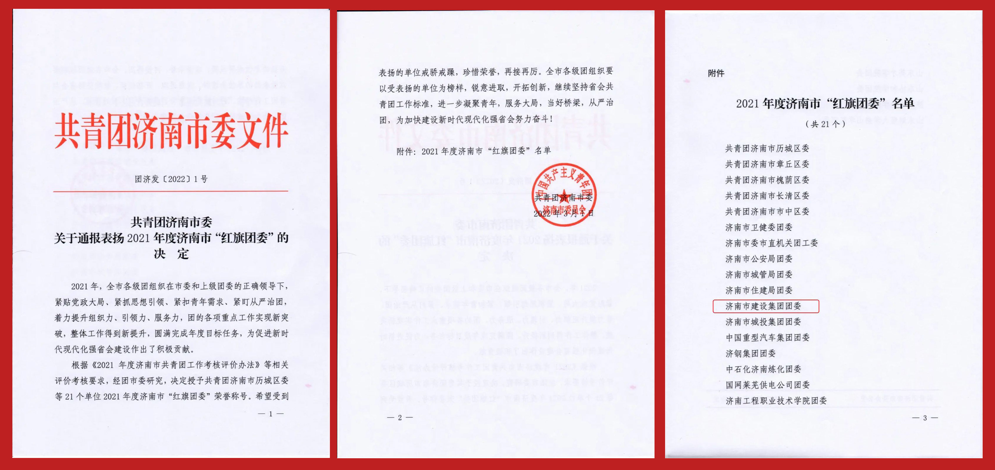 2022年3月1日,共青团济南市十七届四次全委(扩大)会议召开。会议通报了2021年度全市共青团工作综合考核情况,304am永利集团团委被评为2021年度济南市“红旗团委”。共青团济南市委向集团主要领导发来了《2021年304am永利集团团工作考核评价函》,并向集团对共青团工作的支持和关心表示了感谢。