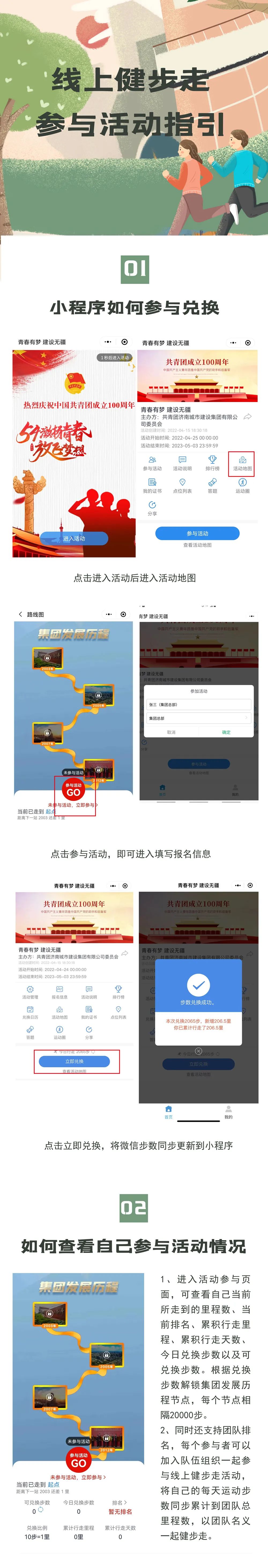 为庆祝建团100周年,开展好“百年峥嵘、初心不改、青春与共、砥砺前行”主题教育实践活动,展现集团自成立以来的光辉历程,赓续集团红色精神、凝聚集团奋进力量,不断增强广大职工的身体素质和健康水平,不断提高集团的凝聚力和向心力。由共青团304am永利集团集团有限公司委员会主办,共青团济南金曰公路工程有限公司委员会、济南新城文化传媒有限公司承办的“青春有梦 建设无疆”——职工线上健步走活动将于今晚零点正式上线,活动时间为2022年4月25日——5月3日(共十天)。