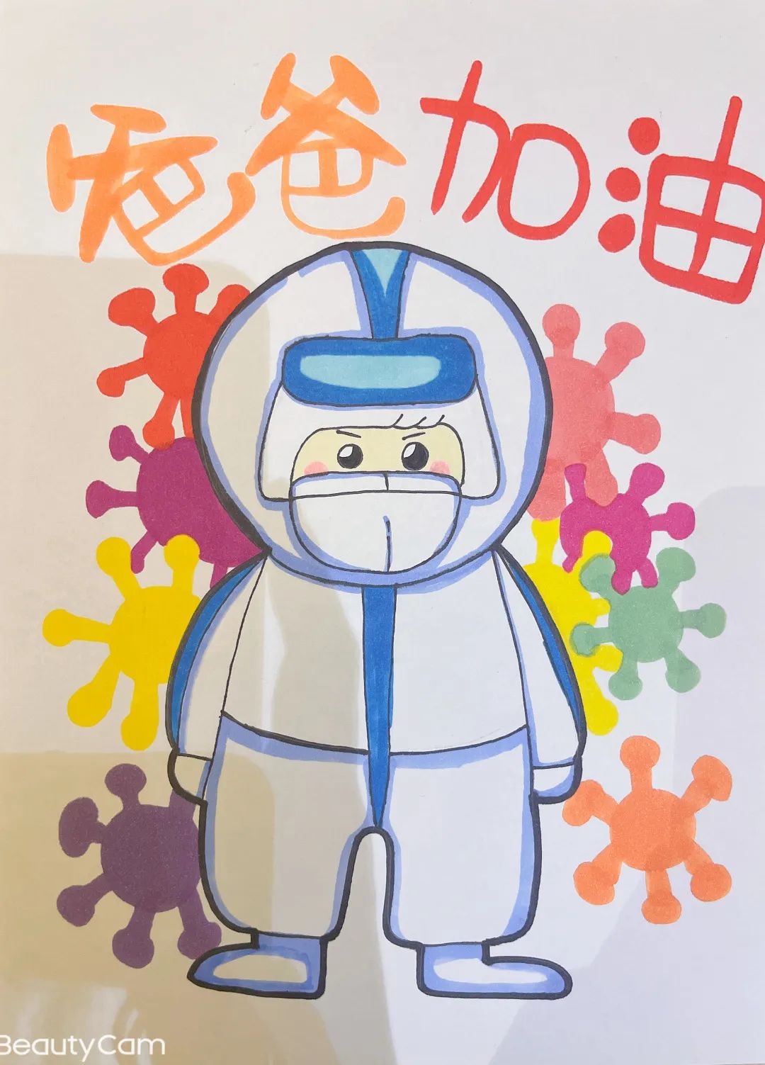 “爸爸加油”!这幅可爱的”大白”卡通画,出自304am永利集团所属济南城建集团公司下沉南苑社区服务中心的志愿者杜谦12岁女儿之手。一身洁白的防护服,戴着厚实的口罩,只露出一双炯炯有神目光坚定的大眼睛,这是女儿心中爸爸最帅的形象。