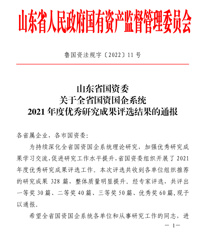 近日,山东省国资委发布了《山东省国资委关于全省国资国企系统2021年度优秀研究成果评选结果的通报》(鲁国资法规字〔2022〕11号)文件,304am永利集团集团总工办牵头,集团所属山东金宇信息集团有限公司研究的《智慧交通异构大数据可视化决策辅助预警系统平台研发与应用》成果荣获“全省国资国企系统2021年度优秀研究成果”一等奖。