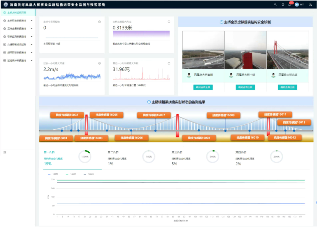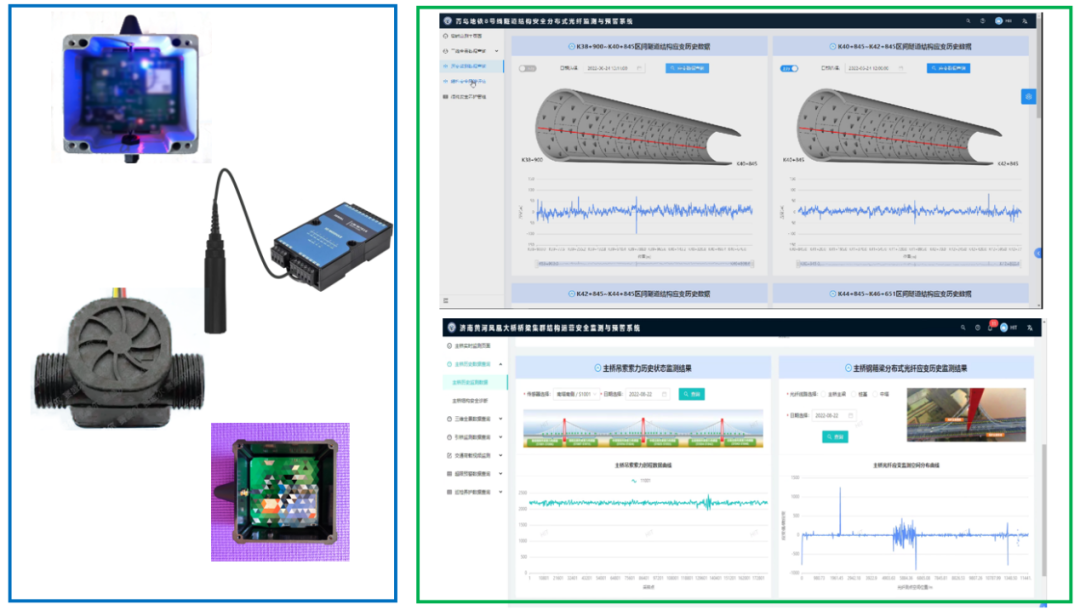 同样,在济南黄河凤凰大桥也搭建了“桥梁集群结构运营安全监测与预警系统”,利用分布式布里渊光纤传感技术,建立桥梁集群结构应变传感网络,利用点式传感技术,监测桥梁集群结构响应与环境荷载信息。