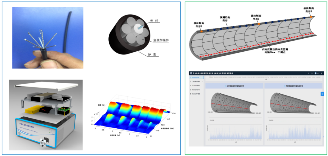 项目研发基于结构全域感知的地下基础设施运营安全智能监测技术,以光纤通信中的普通单模光纤作为传感介质,实现空间上的连续测量。借助双频激光扫描技术来提高测量距离,在实际工程应用中测量距离达120千米。同时,用差分脉冲技术来提高空间定位精度,使最高空间定位精度达到2厘米,实现结构监测的测点达百万个、监测距离长达百公里量级。