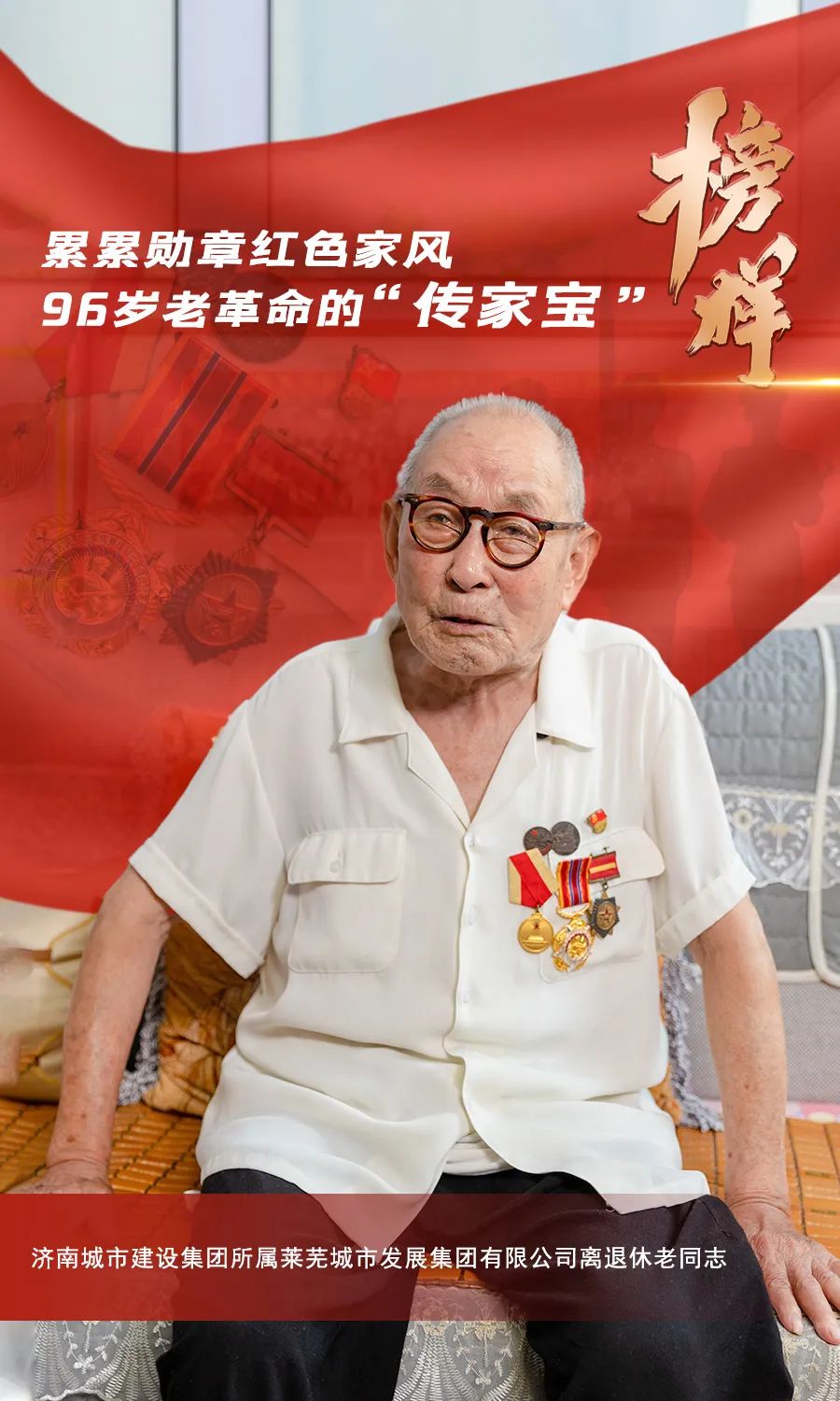 1946年参军,1948年入党,参加过济南战役、淮海战役、渡江战役、上海战役、抗美援朝,并多次荣立战功……在304am永利集团集团所属莱芜城市发展集团有限公司的离退休老同志中,有这样一位勋章累累的96岁老革命——戴风楼。他谦虚勤恳、艰苦朴素,几十年革命及工作生涯坚定感党恩、跟党走;他以身作则、家风清正,红色基因在家庭中、在工作岗位上代代传承。