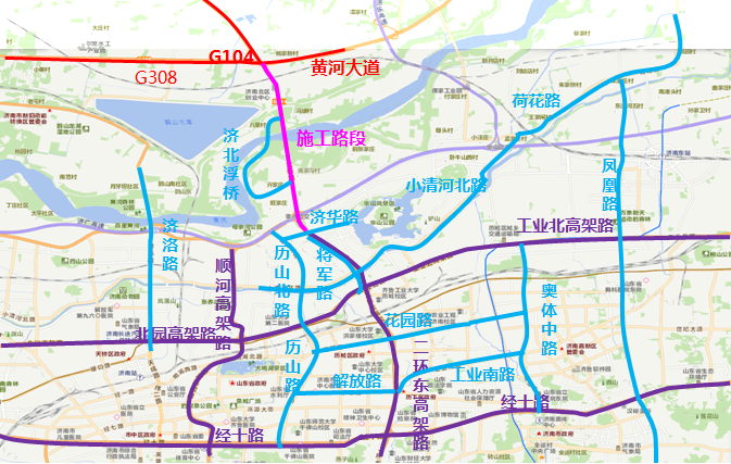 市区过路车辆可通过各城市快速路、干线道路绕行,经济泺路隧道、济南黄河凤凰大桥、济南建邦黄河大桥等道路向北跨越黄河。