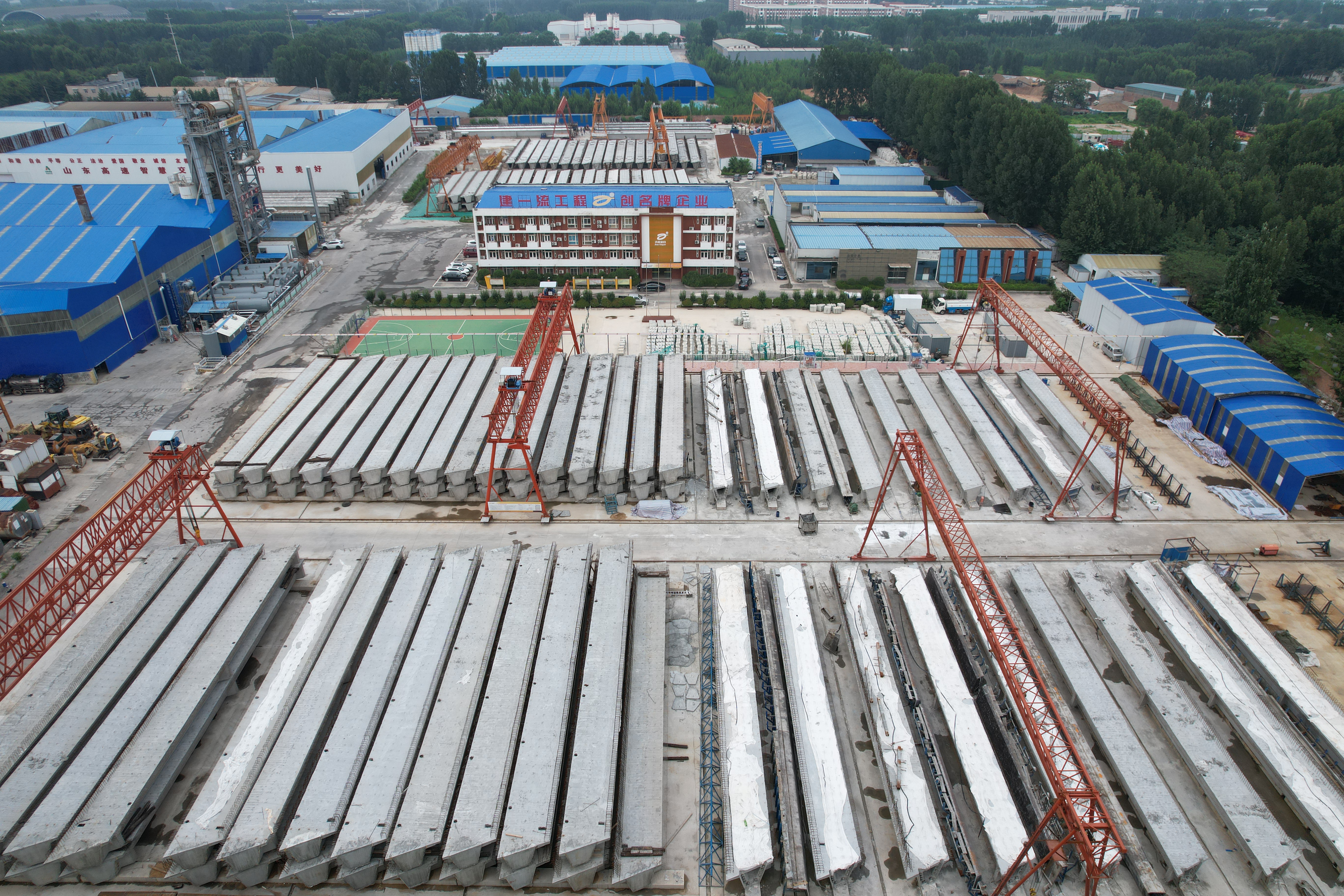 梁板预制于2021年9月24日开始持续稳产,梁场采用复合5+1mm不锈钢模板、智能张拉设备、智能压浆设备和自动喷淋养护等先进工装设备,从而确保预制箱梁质量可控;圣井道材中心预制场于9月6日完成了西巨野河大桥全部箱梁预制工作。