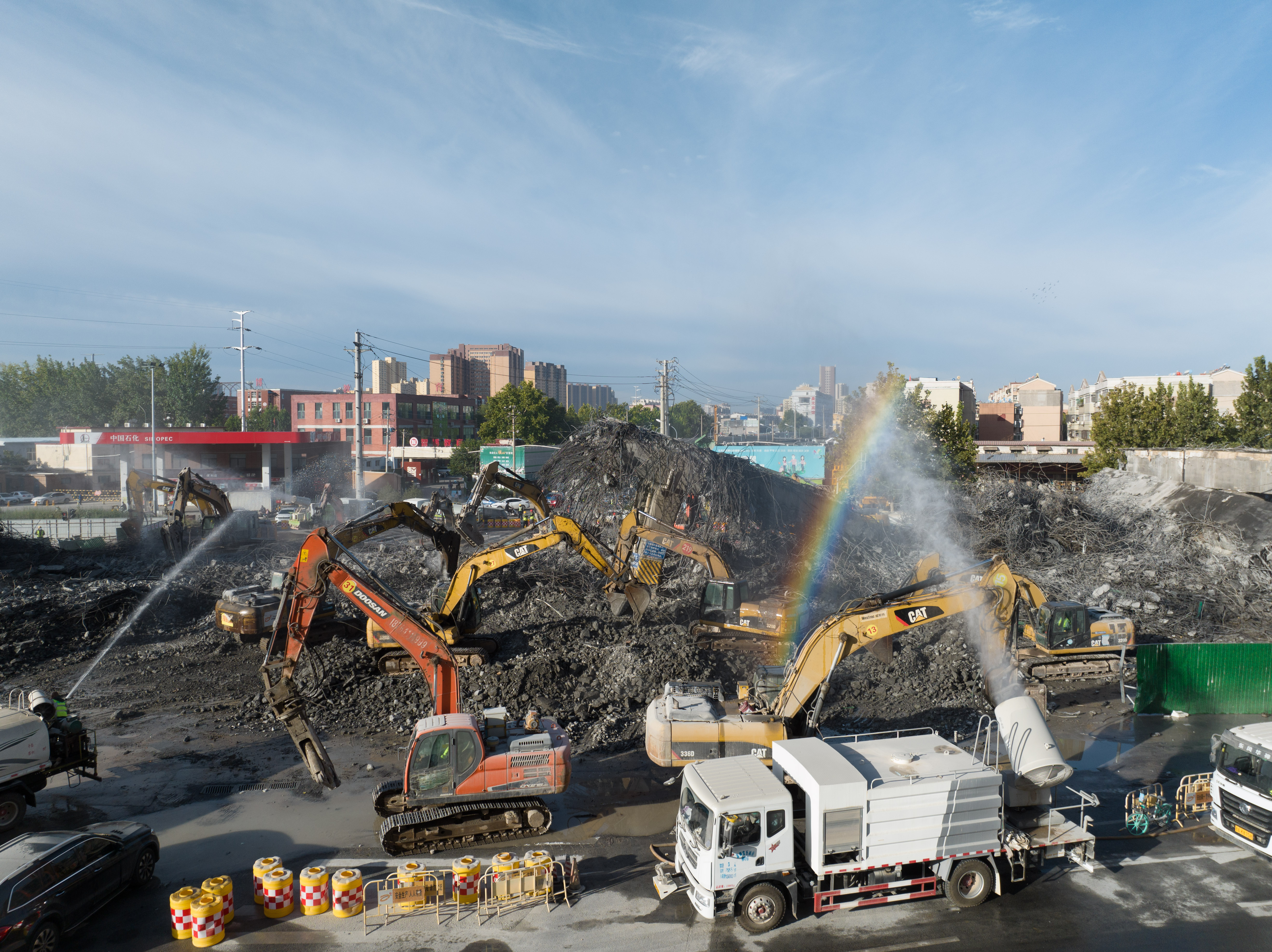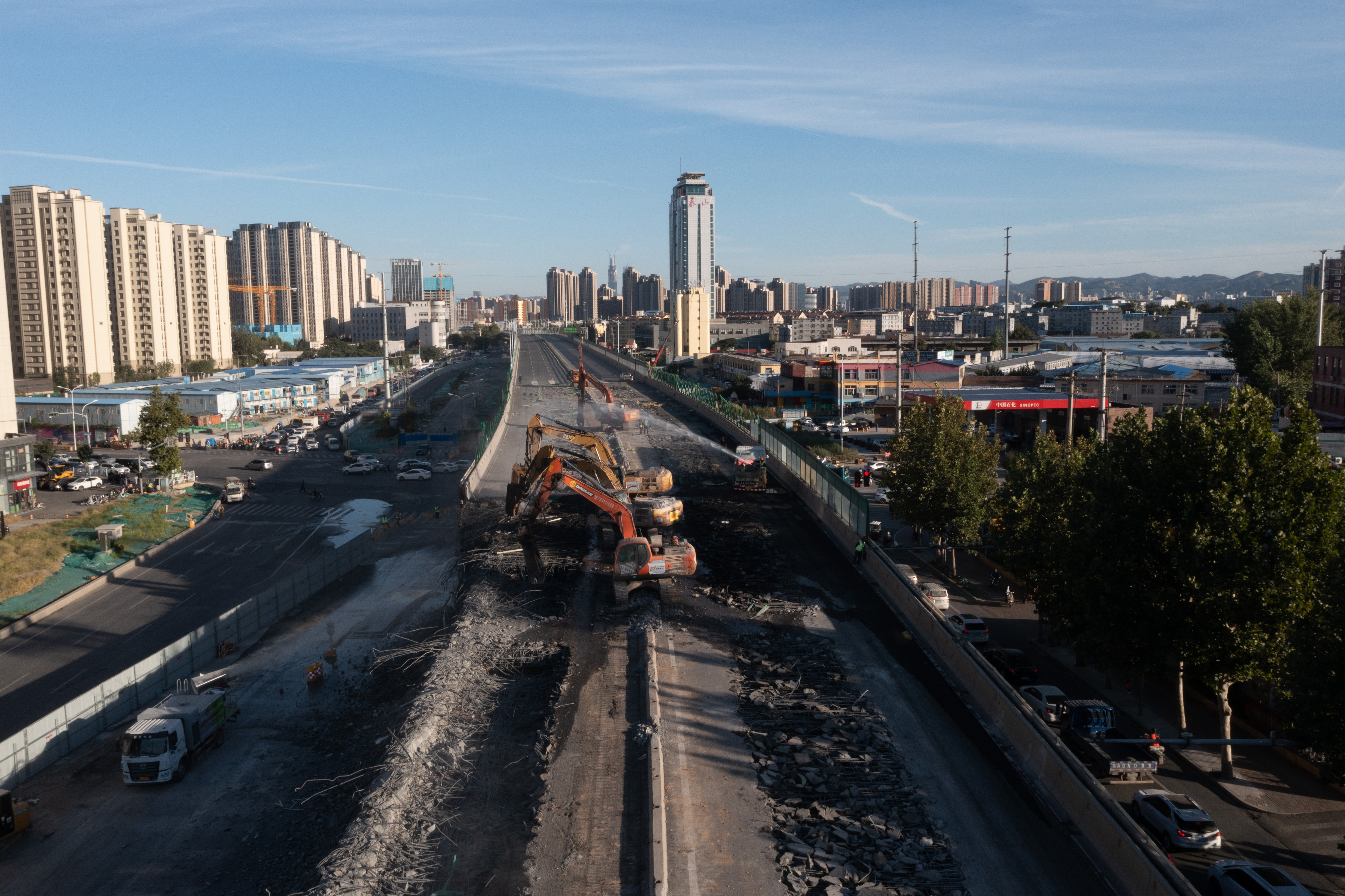 经过前期充分准备,9月23日20:00-9月24日8:00,执行快速拆除任务,将桥身和墩柱全部拆除;9月24日执行拆除后的清理任务。期间33台机械同时作业,整个拆除过程,衔接紧凑、安全有序,确保了二环东高架第四联、第五联安全、快速的完成拆除和恢复车辆通行工作。