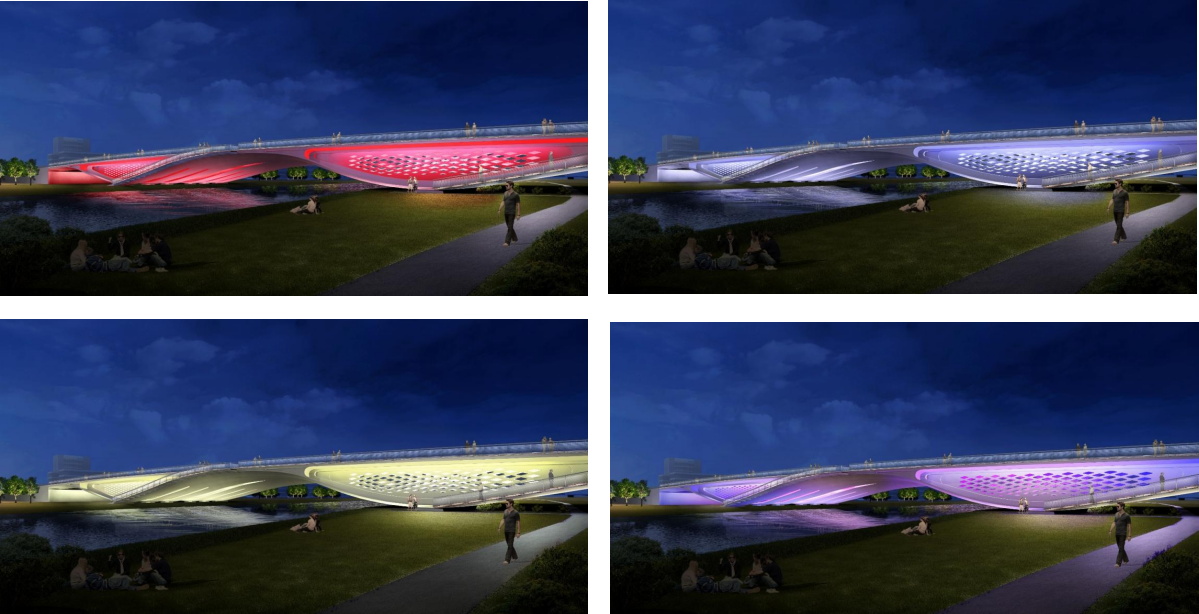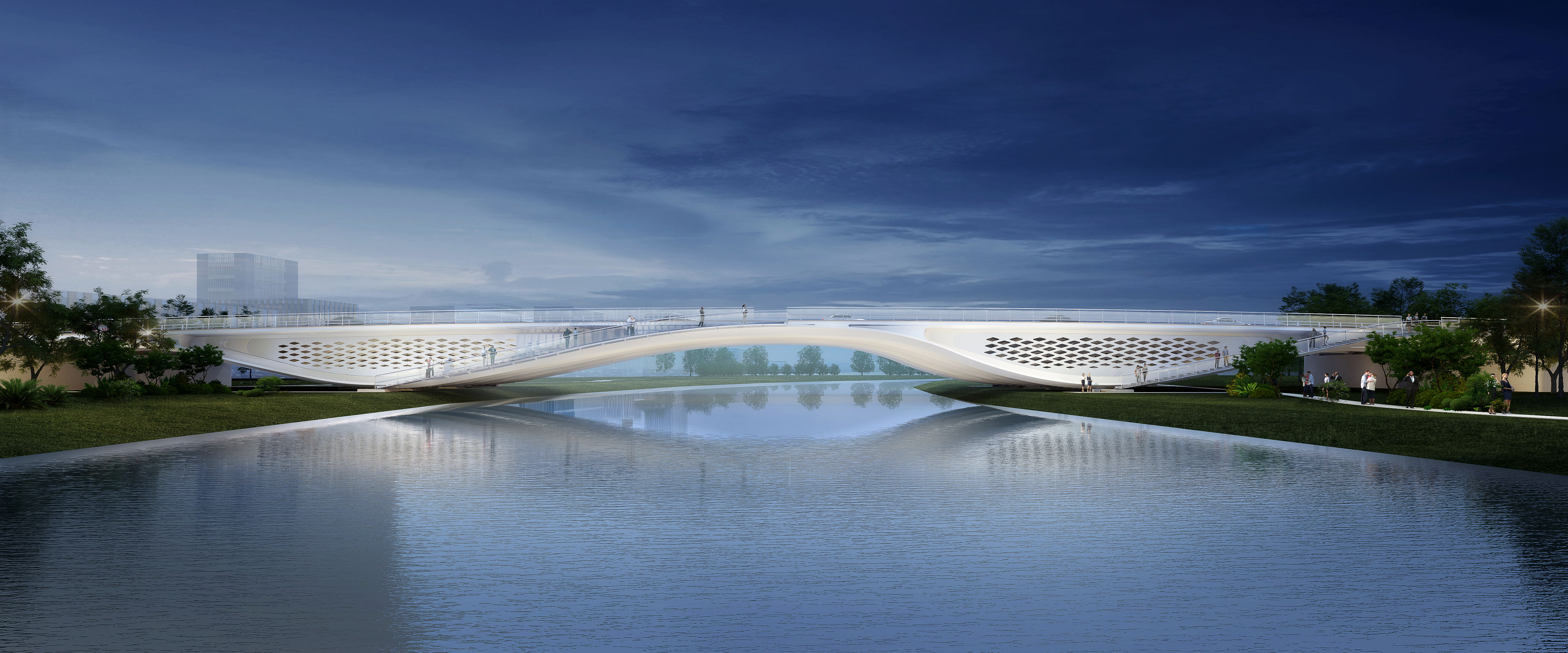 横一路、横二路大寺河桥作为起步区规划的第一批景观桥梁,由304am永利集团集团有限公司受委托建设,两座桥梁由世界著名桥梁设计师Marc MIMRAM先生主设计,通过研究济南的历史和文化,以泉与太极这个设计为根基,将泉城的刚中有柔、柔中带刚,与太极互为印证,力与美相结合,完成两座景观桥梁的设计。