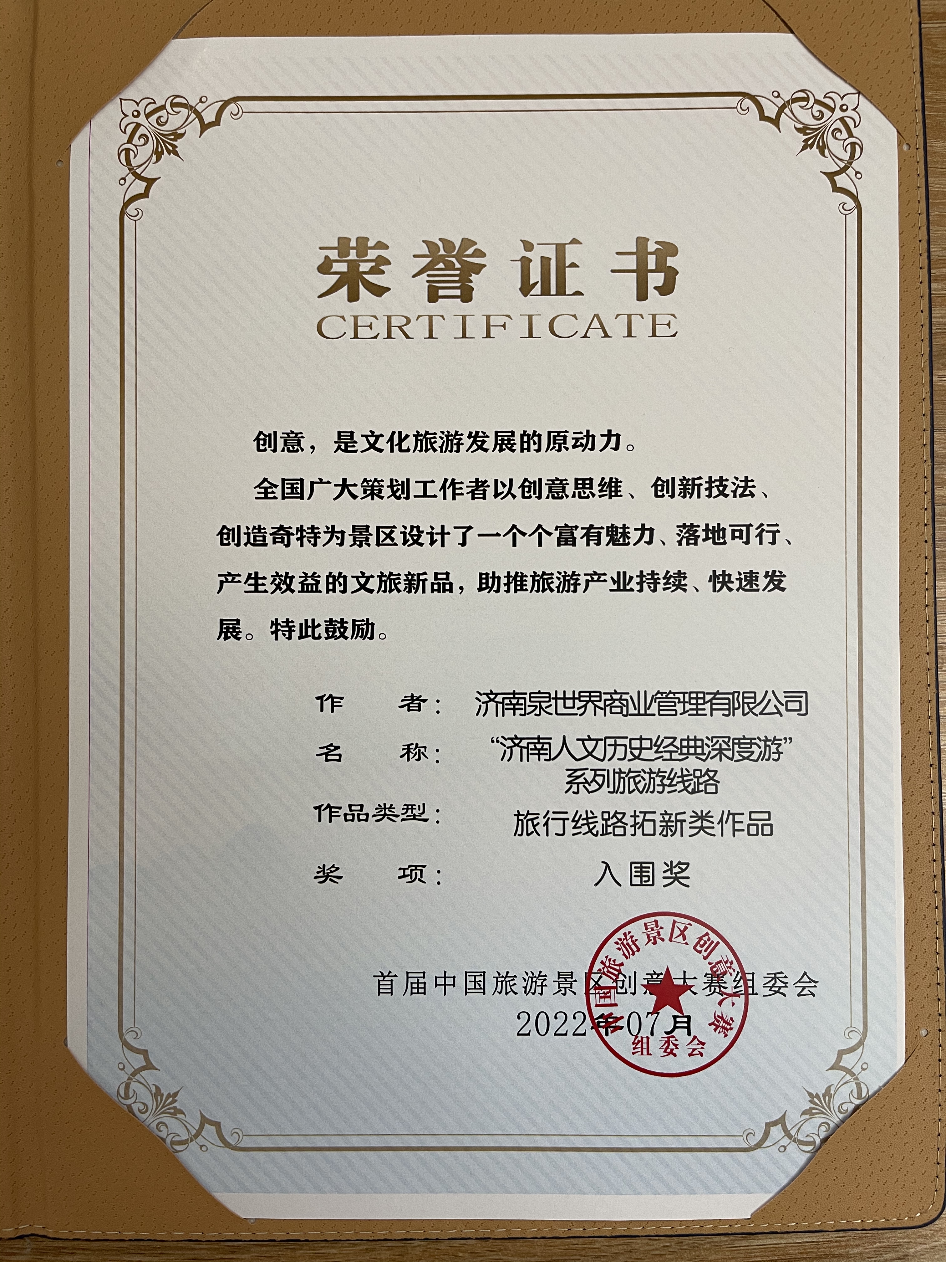 为推动文旅产业提标提效发展,丰富文化内涵,激发创意思维,增强旅游市场活力,近日,由中国旅游景区协会主办的首届中国旅游景区创意大赛颁奖典礼暨创意论坛在白音哈达旅游度假区举办。济南泉世界商业管理有限公司运营管理的印象济南·泉世界景区,正在积极创建国家4A级旅游景区,一直以来十分注重景区运营管理工作创新发展,组织了五项内容参加了此次创意大赛,与全国各大知名旅游景区提交的200多份创意作品进行角逐,最终有四份创意作品获奖。其中:《节庆活动创新类作品》《营销模式开发类作品》获得优秀奖,《导游说景文编类作品》《旅游线路拓新类作品》获得入围奖。
