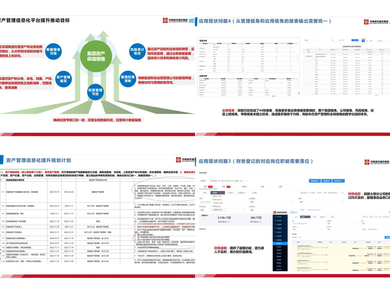 会议根据集团资产管理实际业务及集团资产管理需求,进行了细致总结分析梳理。就目前系统存在数据可用性不完整、业务在线不及时、对数口径不一致、管理范围尚不明确等问题制定了推进目标。会议要求,要进一步规范资产管理、协调推进明析管理权责、实现经营管理可控和数据报表可视、推进开展有效风险审计;要持续调优资产数据、进一步完善报表体系、提升应用场景、优化使用功能。