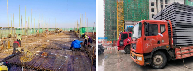 项目整体实行闭环管理,工人生活区位于项目内部,从而保证项目封控期间各楼栋作业人员工种数量齐全,关键岗位不空缺,保障了项目生产“人力”。面对封控、材料供应、运输困难等问题,项目部提早谋划,现场优化布局,提前储备关键物资,如钢筋、预制构件、保温板等材料,同时物料进出场进行专班管理,提前报备、专人接送、封条张贴、专人盯守、过渡区消杀等管控流程配合严密,保障了项目生产“物力”。