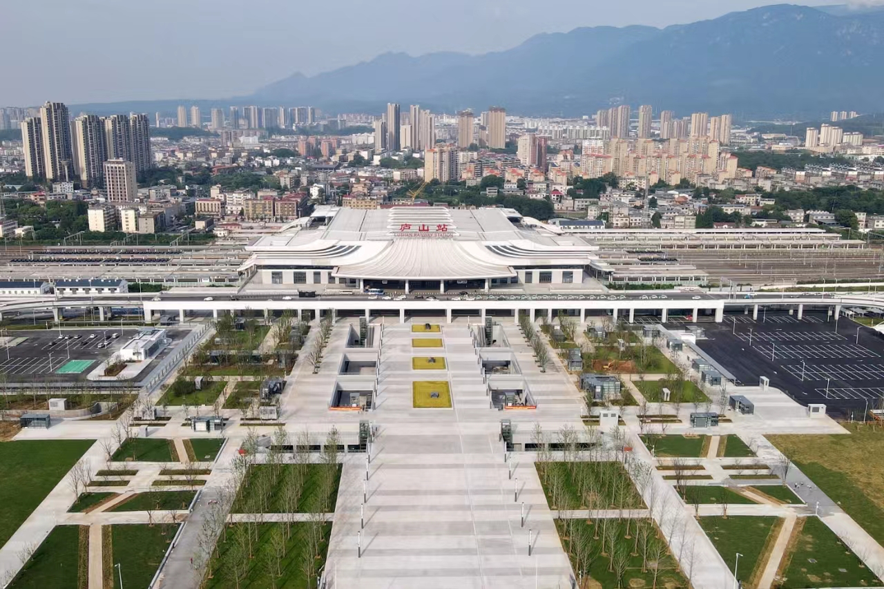 九江庐山站高铁枢纽被定位为昌九走廊新枢纽、赣北发展新引擎、都市九江新门户,远期铁路旅客发送量将达到约2200万人次。城建集团公司承建的九江高铁枢纽工程作为庐山站配套工程,是铁路与公交客运的联系纽带,也是庐山站的交通集散中心。项目建设内容主要包括高架匝道、地面道路、集散广场和地下空间四部分。其中,高架匝道施工由连接快速路、地面道路与庐山站站房的8条匝道桥组成,总长约3.5公里;地面道路施工包括一横四纵的五条道路,总长约2.5公里;集散广场占地约99亩,广场左侧为公交车场站占地面积约18亩,右侧为占地约25亩的长途车场站;地下空间共两层,总建筑面积约为11万平方米。目前项目高架匝道、地面道路、集散广场建设均已完成,并开放投入使用。
