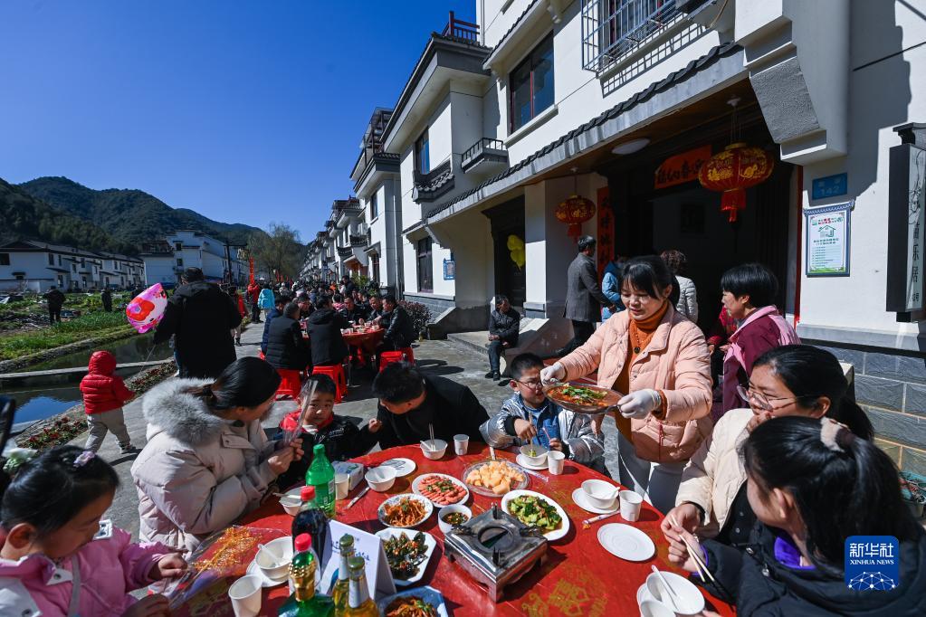 游客在浙江省建德市莲花镇戴家新村的百家宴上品尝特色美食,感受新农村“舌尖上的幸福”(2023年2月26日摄)。新华社记者 徐昱 摄