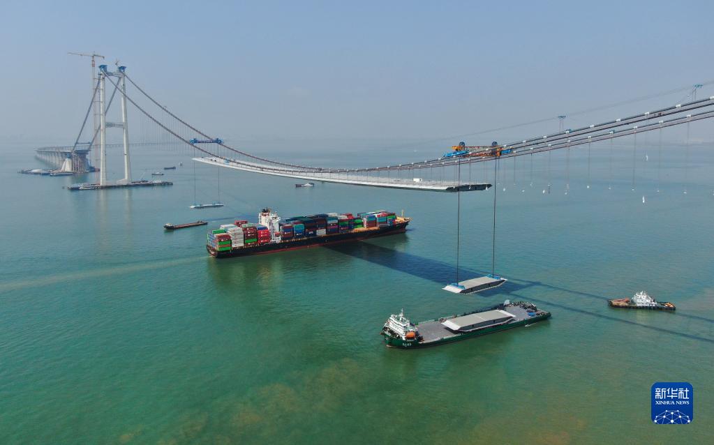 集装箱货轮通过正在吊装钢箱梁的深中通道伶仃洋大桥(2023年2月22日摄,无人机照片)。新华社记者 邓华 摄