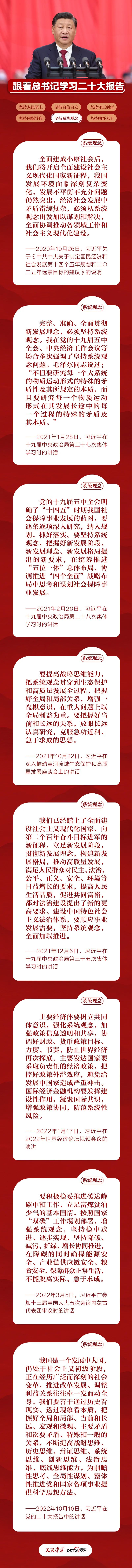 “必须坚持系统观念。万事万物是相互联系、相互依存的。只有用普遍联系的、全面系统的、发展变化的观点观察事物,才能把握事物发展规律。”