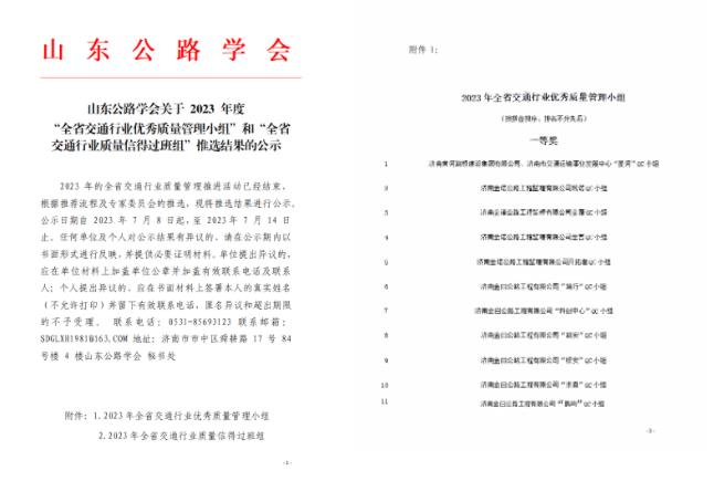 山东公路学会发布《山东公路学会关于2023年度“全省交通行业优秀质量管理小组”和“全省交通行业质量信得过班组”推选结果的公示》。金曰公司“笃行”“科创中心”“路安”“桥安”“求真”“鹊鸣”6个QC小组成果荣获一等奖,其他成果另获二等奖19项、三等奖5项;5个班组获得“全省交通行业信得过班组”称号。