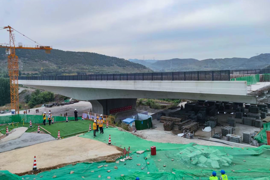 临淄至临沂高速公路上跨辛泰铁路立交桥工程位于临临高速淄博市博山区,桥体长100m,桥面宽38.2米,总重量1.3万吨,是临临高速三标段的控制性工程。此次转体采用2套连续千斤顶牵引预埋好的钢索绕转盘转动,在转体过程中,技术人员时刻监测墩柱轴线变化以及桥梁悬臂两端高程变化情况。整个梁体顺时针旋转83.9度后精准到达设计位置。随后技术人员进行姿态调整和转盘封铰后圆满完成此次转体施工。