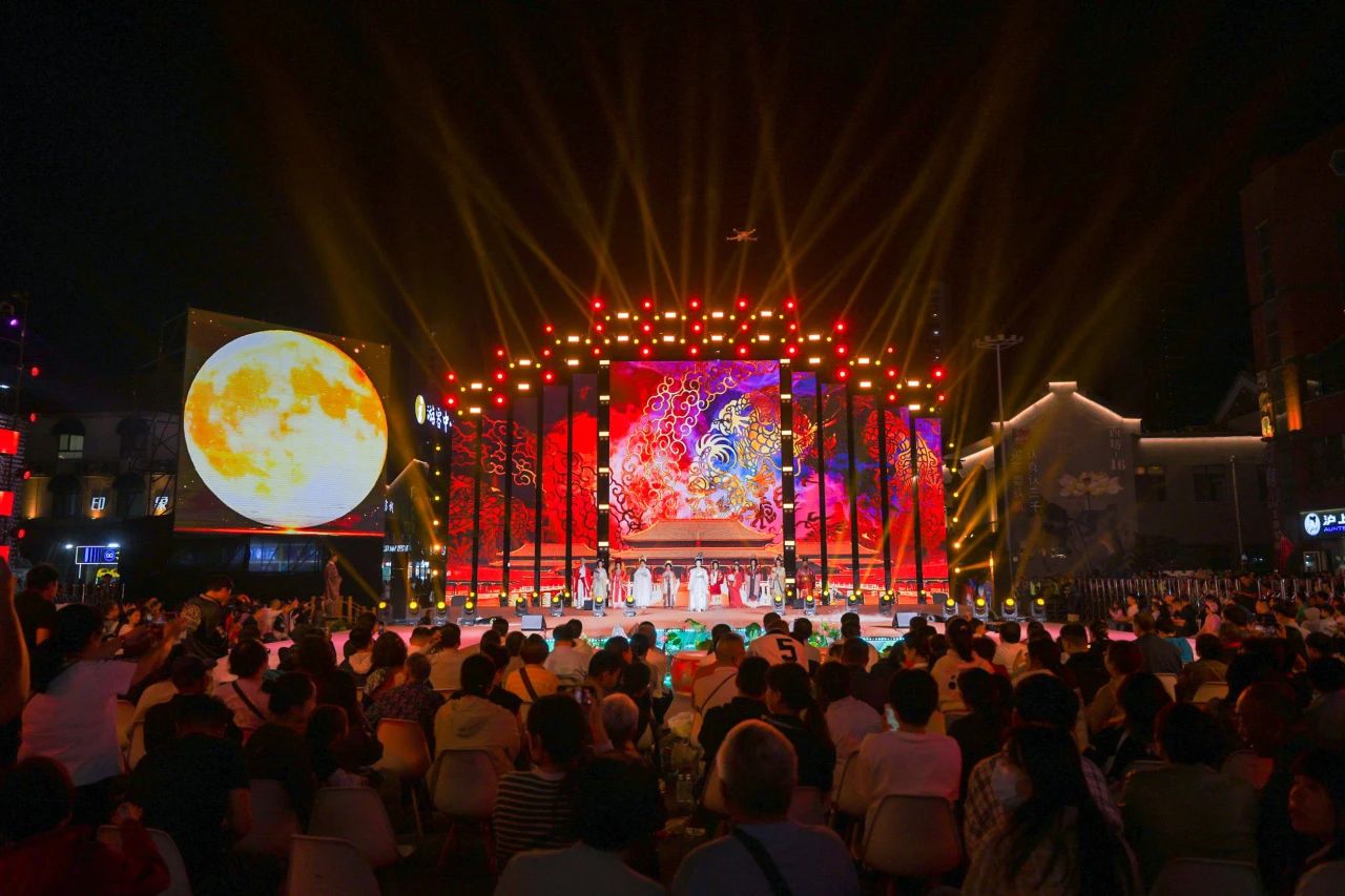 音乐、舞蹈、杂技、灯光秀……街区上流光溢彩、灯火辉煌,舞台上衣香袂影、霓裳起舞,市民游客共赴秋月古风浪漫,共享中国文化之美。今年中秋拜月大典将中秋佳节所蕴含的传统习俗、乡愁思念和家国情怀融为一体,以歌舞、乐器、戏曲曲艺非遗为主要载体,唯美、浪漫,创新打造具有未来感的全景式舞台,在虚与实、古与今、远与近的巧妙转换中实现沉浸式体验。在活动现场,已经连续参加六届拜月大典的市民王鹏飞告诉记者:“今年我把刚1岁的宝宝也带来了,文化熏陶要趁早,以后还要年年来,这样才能不忘初心嘛!”
